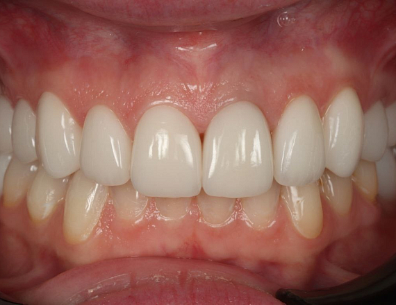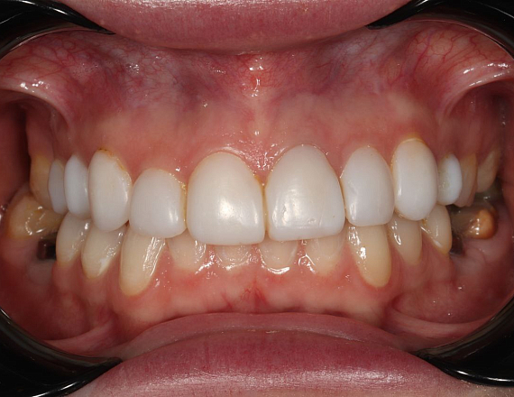 Дисколорит 21 зуба, рецессия по 1 классу. Проведена пластика рецессии, изготовлена цельнокерамическпя коронка.